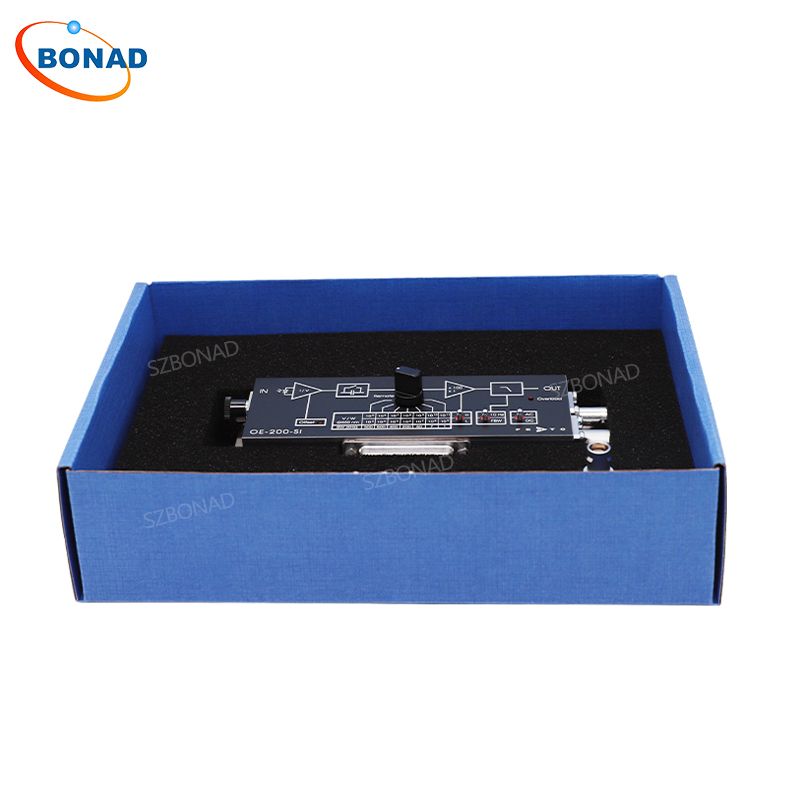 OE系列的可变增益光接收器用于需要对各种各样的小光信号快速而且测量的应用程序。一个低噪声跨阻放大器和硅或砷化铟镓光电二极管的组装具有一个宽广的波长范围从 190 到 1700 nm 。集成电路放大器提供了可调节增益从103至1011V/W,因此测量的宽动态范围可以超过从100fW直到2mW的光输入功率。它的敏感度使造就它的低噪声功能从而使噪声等效功率达到小10fW/√Hz。很多其他的特征如可调节信号过滤器,可调节偏移和通过个人电脑手动或者光隔离远程控制功能,使OE-200成为同等级别全能的光接收器。