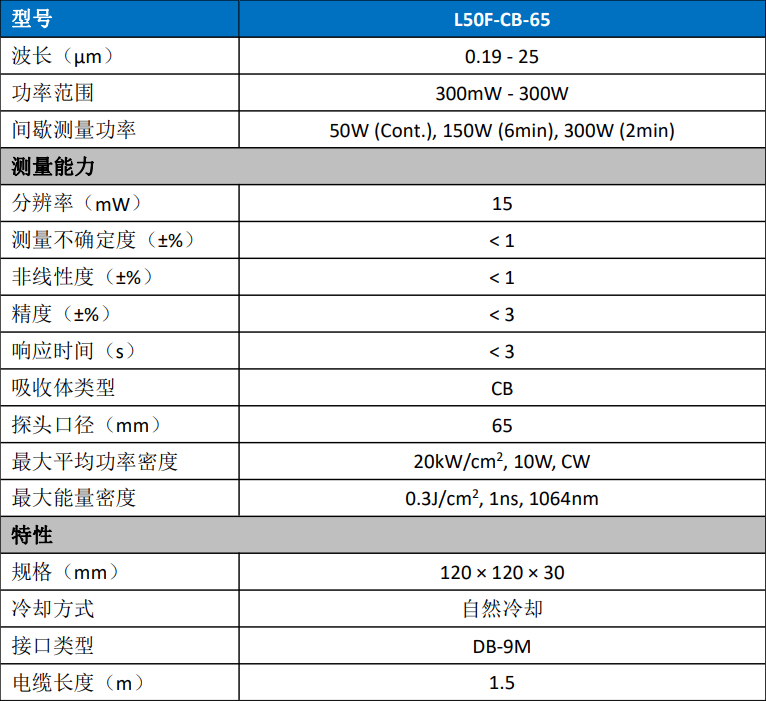 L50F-CB-65型热电式激光功率计探头,适用于测量高功率密度的连续和脉冲激光,自然风冷模型下*大持续测量功率可达50W,*大间歇测量功率可达300W,具有65mm的大探测口径。