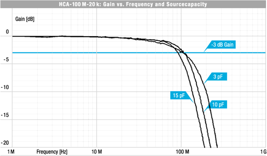[V/A]Rise/Fall Time Max. Detector Capacitance HCA-1M-1M 1 MHz 270 fA 1x10^6 350 ns 50 pF HCA-1M-1M-C 1 MHz 3.5 pA 1 x 10^6 350 ns 2 nF HCA-2M-1M 2 MHz 340 fA 1 x 10^6 180 ns 25 pF HCA-2M-1M-C 2 MHz 3.5 pA 1 x 10^6 180 ns 1 nF HCA-4M-500K 4 MHz 490 fA 5 x 10^5 90 ns 15 pF HCA-4M-500K-C 4 MHz 3.5 pA 5 x 10^5 90 ns 500 pF HCA-10M-100K 10 MHz 1.1 pA 1 x 10^5 35 ns 15 pF HCA-10M-100K-C 10 MHz 3.5 pA 1 x 10^5 35 ns 150 pF HCA-20M-100K-C 20 MHz 3.5 pA 1 x 10^5 18 ns 50 pF HCA-40M-100K-C 40 MHz 3.7 pA 1 x 10^5 10 ns 30 pF HCA-100M-50K-C 100 MHz 3.8 pA 5 x 10^4 3.5 ns 20 pF HCA-200M-20K-C 200 MHz 4.9 pA 2 x 10^4 1.9 ns 8 pF HCA-400M-5K-C 400 MHz 21 pA 5 x 10^3 1.0 ns 10 pF*