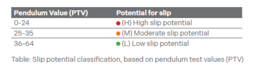 摆锤测试测量的是动态摩擦系数 (CoF)。该测试旨在模拟行人脚跟着地的瞬间,也就是大多数滑倒发生的瞬间。