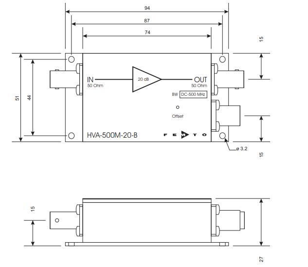 - 直流耦合低噪声500MHz带宽电压放大器模块HVA-500M-20-B