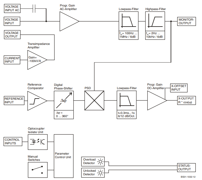 signal monitor outputSensitivity (Full Scale) Voltage: 3 µV – 1 V in 1-3-10 steps Current: 30 pA – 10 µA in 1-3-10 steps Voltage Input True-differential instrumentation amplifier, noise 12 nV/√Hz Current Input Transimpedance amplifier, gain 100 kV/A, noise 0,4 pA/√Hz Reference Input ±100 mV to ±5 V, switchable to TTL Phase Adjustable 0° - 360°; resolution: 8-bit @ f ≤ 60 kHz, 7-bit @ f > 60 kHz, temperature drift <0,01°/K Max. Dyn. reserve 80 dB Control Interface 16 Opto coupler protected digital inputs, TTL/CMOS compatible 8 bit phase, 4 bit time constant, 4 bit sensitivity Power Requirements ±15 V, +120 mA / -60 mA Dimensions 160 x 100 x 20 mm (L x W x H), weight 100 g (0.22 lbs)