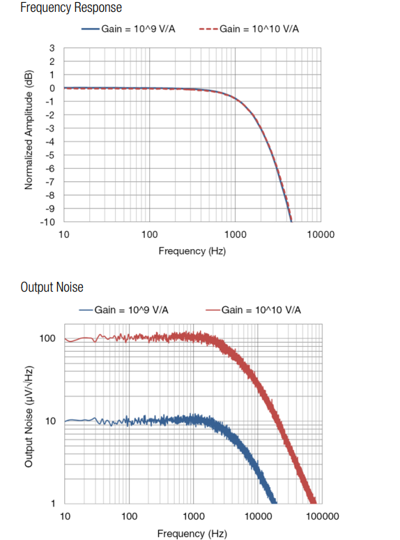 ● 跨阻增益:可在 10^9 V/A 或 10^10 V/A之间切换