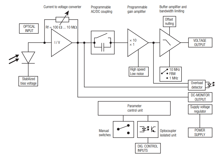 ● MHz 范围内的低噪声光接收器(光电转换)