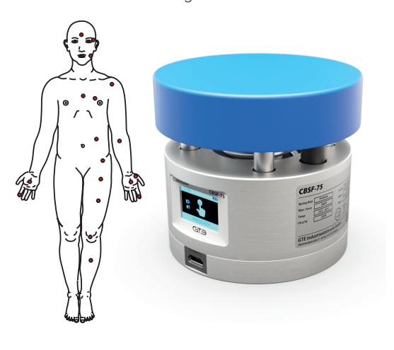 ISO 10218-2:2025工业机器人压力测试设备CobosafeCoboSafe 采用“生物仿生”技术,即模拟人体,从而确保真实的碰撞场景。测量系统的力测试仪包含弹簧和阻尼元件,可以模拟几乎所有相关人体部位的变形行为。这使得能够根据以下标准测量生物力学极限值: