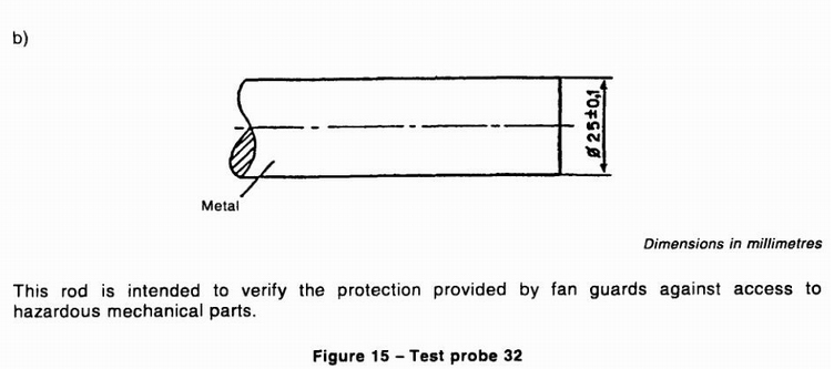品牌:BND 型号:BND-32 加工定制:是 类型:精密 规格:1个 适用范围:家用电器 IEC 61032标准的32号测试探针是用于验证家用及类似电器设备风扇防护罩安全性的专用工具。采用坚固耐用的精密设计,直径为25mm,能够模拟通过防护罩开口接触危险机械部件的情况。该探针由耐用金属制成,可承受反复测试,用于检查风扇防护罩是否能有效阻挡与运动部件的意外接触,从而防止人身伤害。它符合IEC和UL等全球标准,是风扇安全合规性检查的必备工具。
